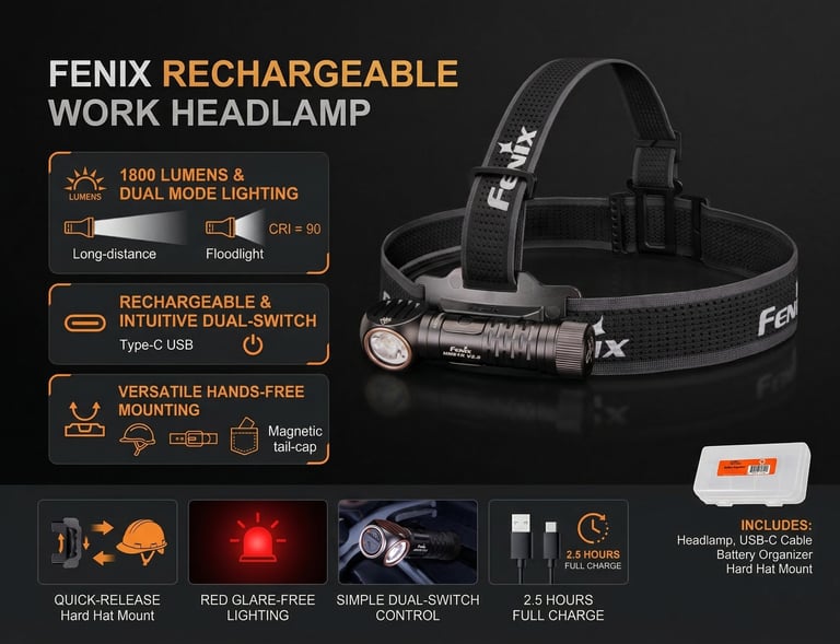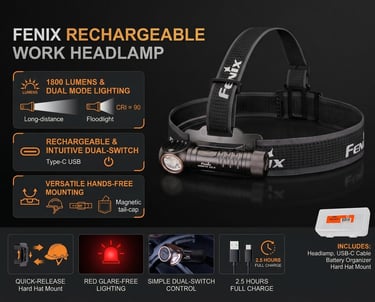 The Fenix HM61R V3.0 Rechargeable Headlamp is a high-performance lighting tool built for demanding outdoor, industrial, and emergency use. Delivering up to 1800 lumens of brightness with a beam distance of nearly 195 meters, it provides powerful illumination for everything from night hikes to job site work. With multiple lighting modes , including spotlight, floodlight, and red light , it adapts easily to different environments and tasks.