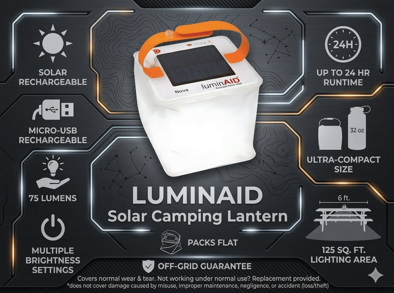 The LuminAID PackLite Solar Inflatable Lantern is a lightweight, all-in-one lighting solution designed for camping, travel, and emergency preparedness. Delivering up to 75 lumens of bright LED light with multiple brightness settings, it provides reliable illumination for tents, campsites, or power outages. With both solar and USB recharging, it offers flexible, eco-friendly power wherever you go, and can run for up to 24 hours on a single charge.