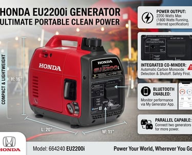 The Honda EU2200i is a top-tier portable inverter generator engineered for dependable, quiet performance whenever and wherever you need it. With 2200 watts of peak power and 1800 watts of running power, it delivers clean, stable electricity ideal for sensitive electronics, tools, appliances, and outdoor gear.