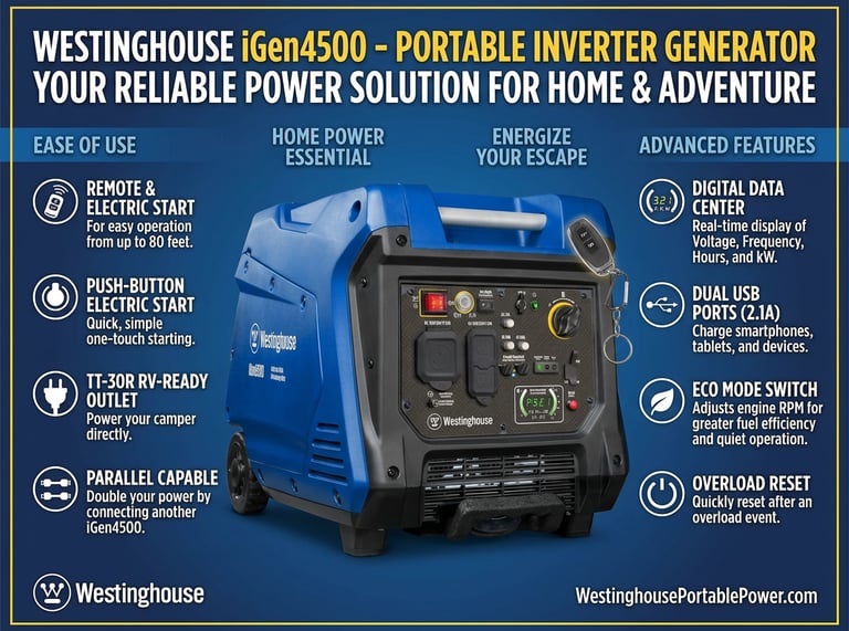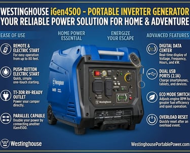 The Westinghouse iGen4500 delivers reliable portable power with advanced inverter technology, making it an excellent choice for camping, outdoor events, home backup, and job site use. With 4500 peak watts and 3700 running watts, it provides plenty of clean, stable energy to run appliances, tools, electronics, and more with confidence.