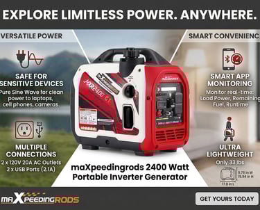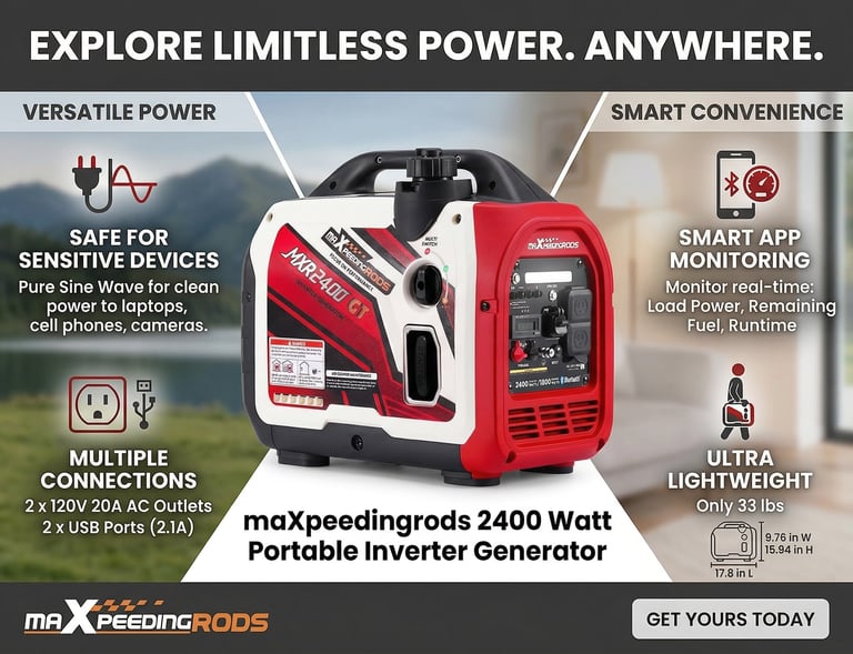 The maXpeedingrods 2400 W Portable Inverter Generator offers reliable, efficient power in a compact and lightweight package, perfect for camping, tailgates, RVs, job sites, and emergency backup. With 2400 peak watts and 2000 running watts, it can handle essential appliances, tools, and sensitive electronics. Its inverter technology provides clean, stable electricity, making it safe for phones, laptops, tablets, and more.