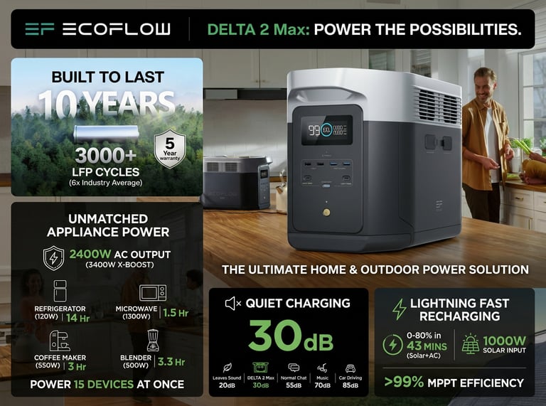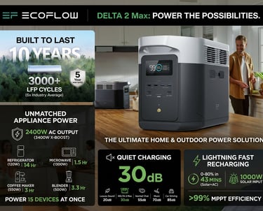 Stay powered at home or off-grid with the EF ECOFLOW DELTA 2. Featuring a 1024Wh long-lasting LiFePO₄ battery and 1800W AC output, it easily runs essential appliances, tools, and electronics. Recharge fast via AC or solar, and power multiple devices at once with versatile AC, USB-C, and DC ports.
