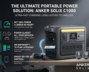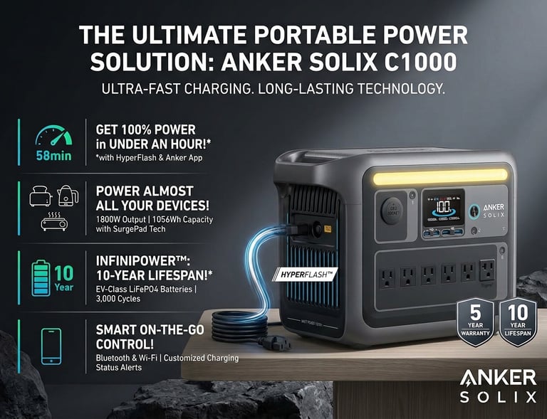 Compact yet powerful, the Anker SOLIX C1000 delivers over 1000Wh of capacity and up to 1800W output — enough to run essentials like laptops, mini-fridges, power tools, and more. With ultra-fast recharging and solar compatibility, it’s perfect for camping, RV trips, home backup, and emergencies. Reliable, versatile, and built to keep you powered wherever life takes you.