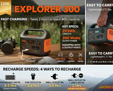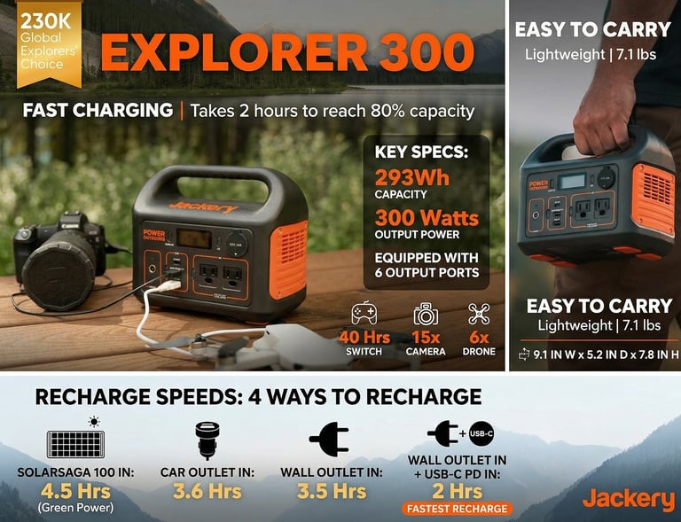 Jackery Explorer 300 Portable Power Station is a compact, lightweight portable power station with a 293 Wh lithium-ion battery that provides up to 300 W of continuous AC power (500 W peak) for small appliances, devices, and emergency use. It features multiple output ports including AC, USB-C, USB-A, and a 12 V car outlet, allowing you to charge phones, laptops, lights, and other electronics simultaneously. Rechargeable via wall outlet, car adapter, or optional solar panels, it’s ideal for camping, road trips, outdoor events, or backup power during outages.