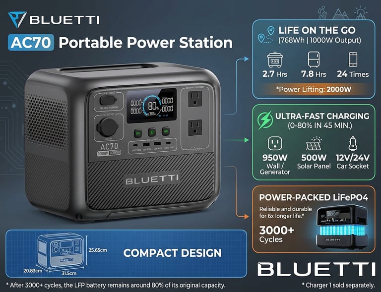 The BLUETTI AC70 delivers dependable portable power for camping, road trips, home backup, and everyday use. Equipped with a 768Wh long-lasting LiFePO₄ battery and 1000W continuous output (2000W surge), it easily powers essential devices and small appliances.